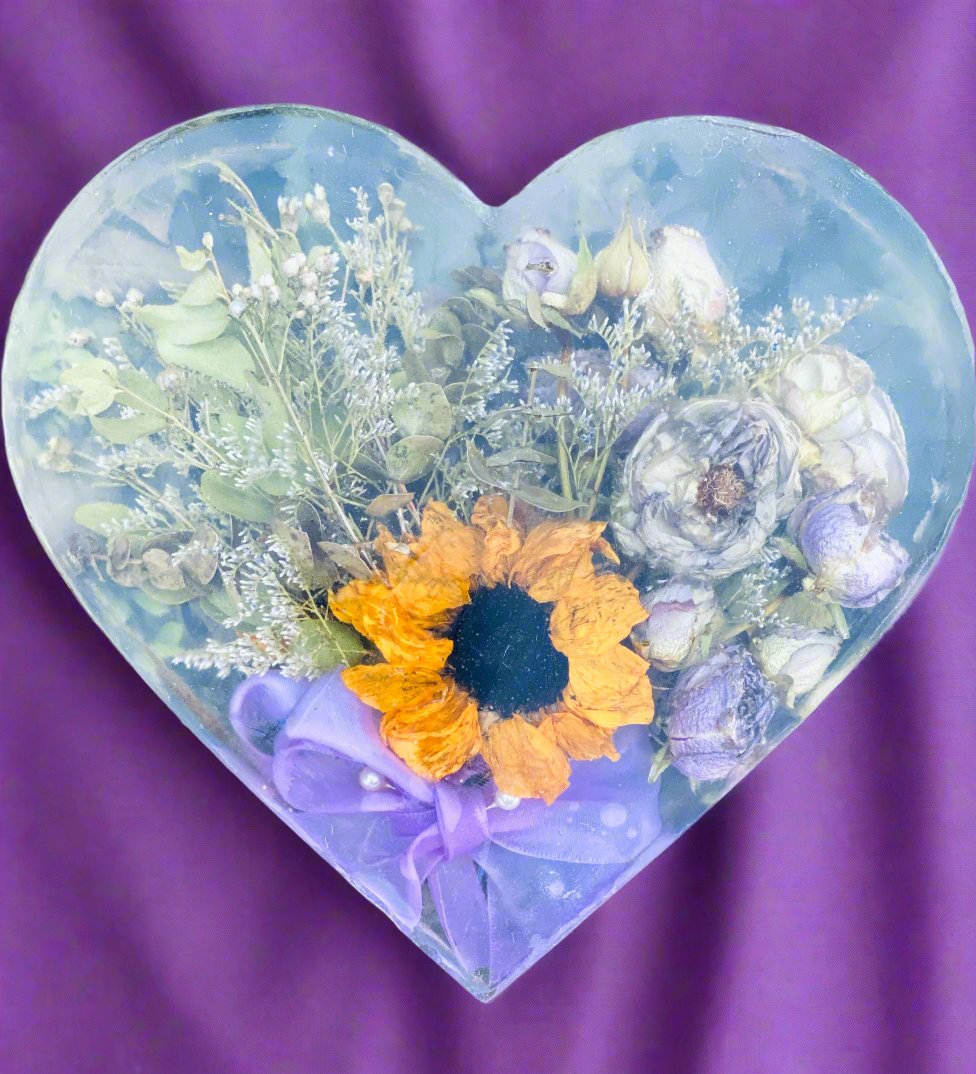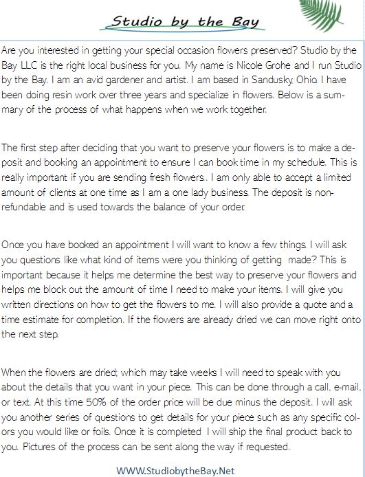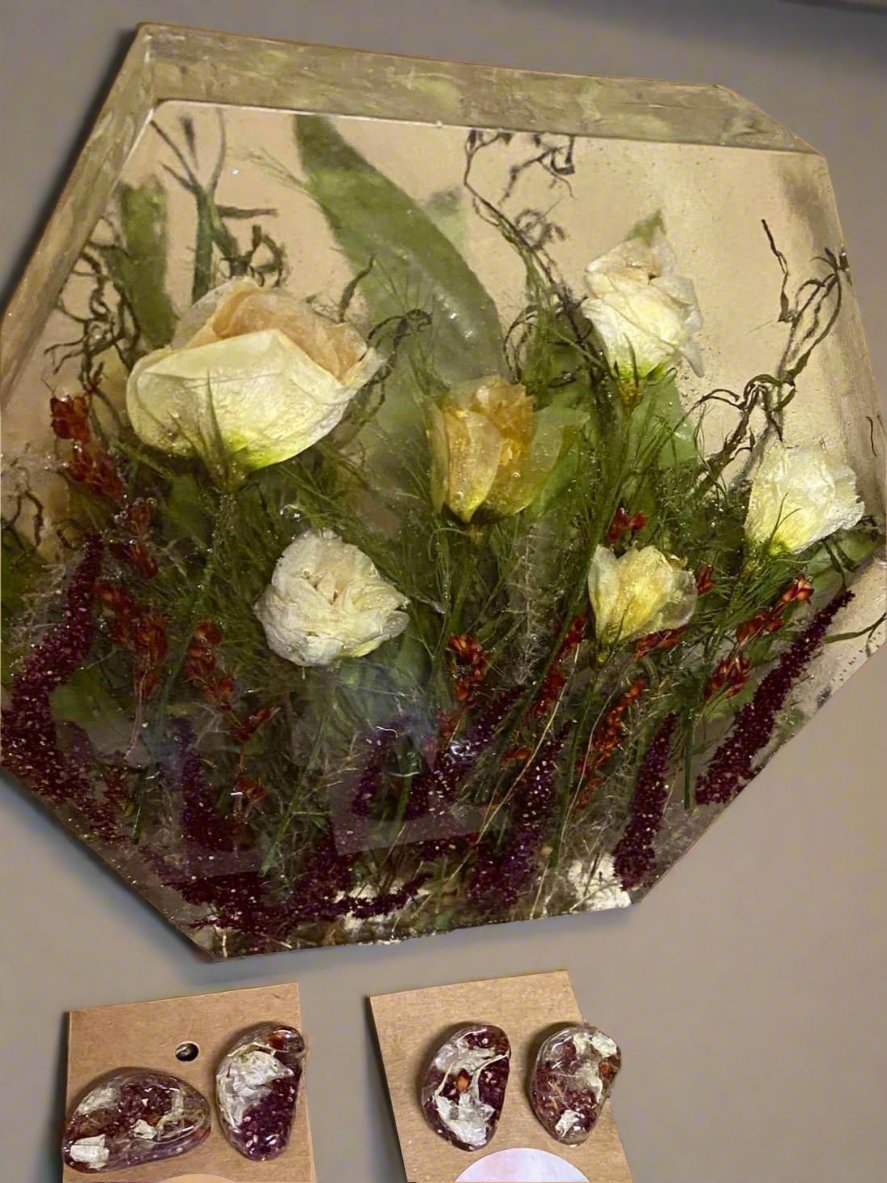 unique is that everything is made by hand by me. I am the only one you work with through the entire process. It is very personalized. No two pieces are alike. With that there is a lot of room for flexibility and creativity.Both UV and epoxy resin are used to preserve items with a multitude of drying techniques being applied for fresh materials. Glitters, foils, and other additives can be added to make your piece shine. Color correction options are available for those who want a little extra vibrancy.